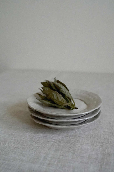 Each piece is individually coiled and pinched into shape and glazed with creamy tin glaze. The result, a glassy surface that plays off the bumpy surface of the imperfect forms making each piece uniquely beautiful and impossible to replicate.