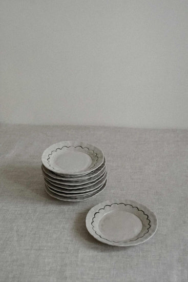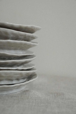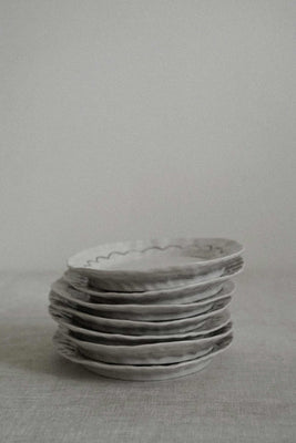 Each piece is individually coiled and pinched into shape and glazed with creamy tin glaze. The result, a glassy surface that plays off the bumpy surface of the imperfect forms making each piece uniquely beautiful and impossible to replicate.