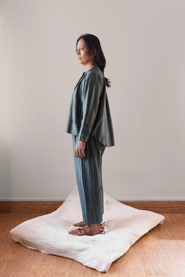 Above the ankle, comfort fit pyjama pants, with elasticated waist and drawstrings. Pants have a faggoting and pleat detail in the bottom.