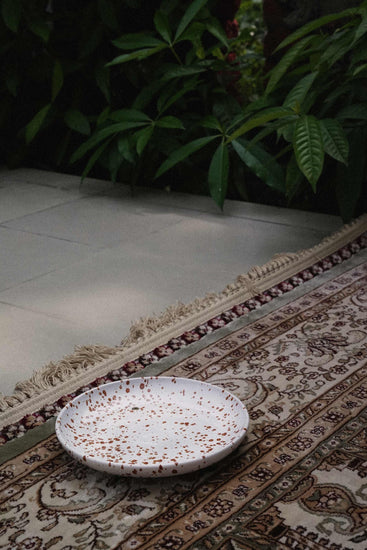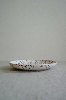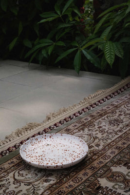 Made in the ceramics capital of India, Khurja, the chaapa plate is our attempt at finding uniqueness in uniformity. Although these plates are moulded, by approaching them with a splatter style glaze, the playfulness of handmade is kept intact. Also incorporated is a singular dot of gold vermeil that is painted on at random as an unexpected but pleasant surprise.