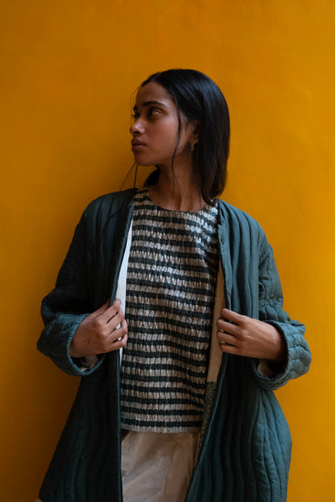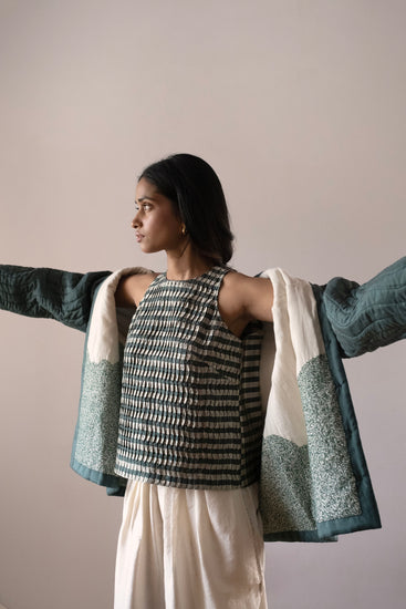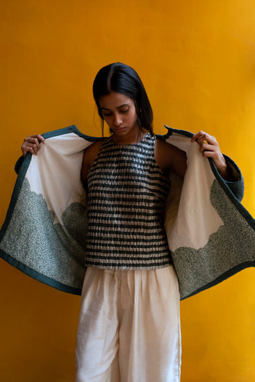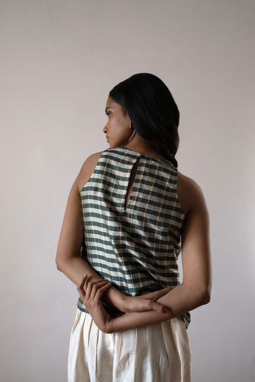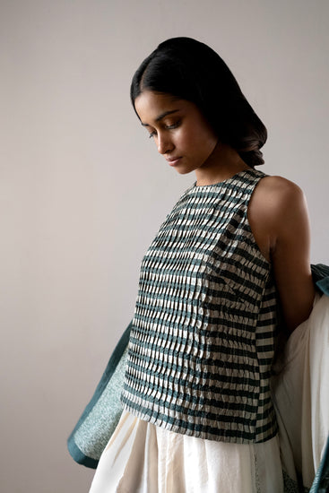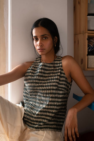 The Chironji top is Serai's version of a dressy racerback. The front is pleated and the back has a keyhole design. The Chironji is designed to be a boxy fit.