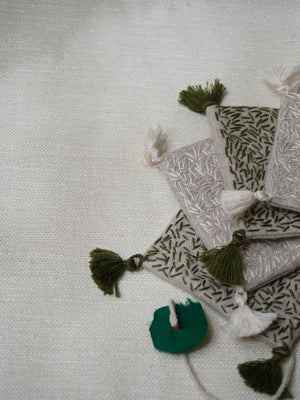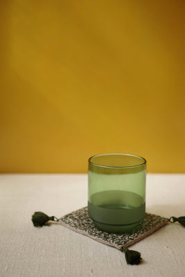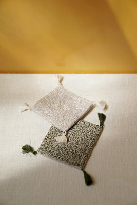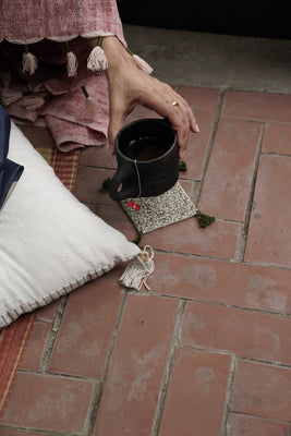 Intricately embroidered blankets, made using a patchwork of old sarees and other textiles were part of the wedding trousseau for young brides, usually made by the women of the bride’s family. These would depict scenes from nature or everyday domestic life and many of them had a narrative built into them. For our coasters, we decidedly chose to name them after an indigenous rice, because what’s more quintessentially Bengali? The Kanakchoor coasters are embroidered in a rice grain kantha, that add texture and movement, the randomness is reminiscent scattered rice on a plate.