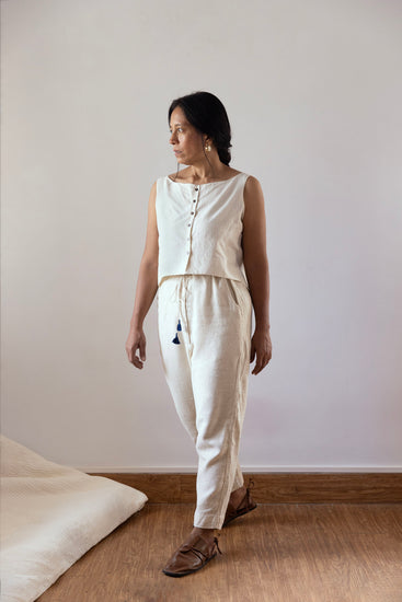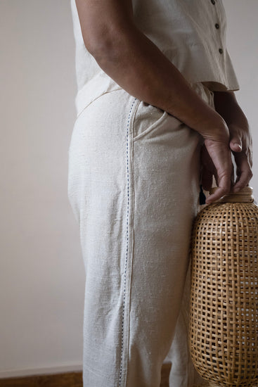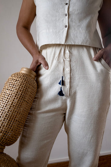 These pants are made of a thick, slubby, hand spun silk with a beautiful sheen and a contrasting blue kantha stitch running along the side seams. Elasticated at the back for ease and with drawstring detail for better fit.