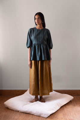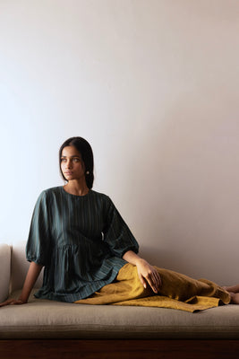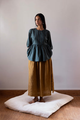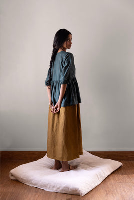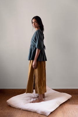 The Mahua skirt is made with handloom linen woven in West Bengal. It has an elasticated back and a drawstring front. The skirt has pockets and a slit on the left side with buttons provided for those who prefer to conceal the slit.