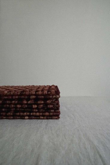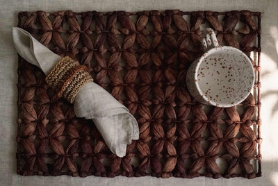 The NIVAH place mats are made of naturally dyed water hyacinth hand-woven on a metal frame in an intricate lattice pattern.
