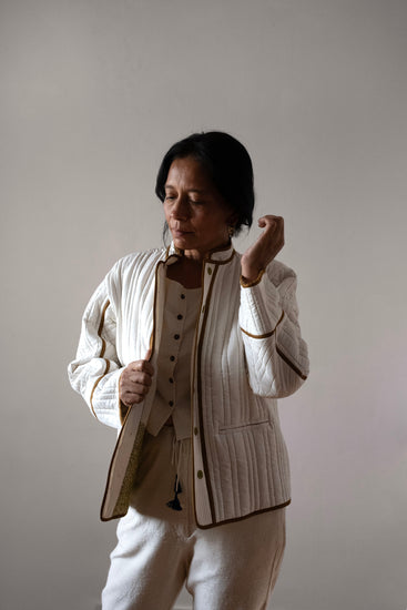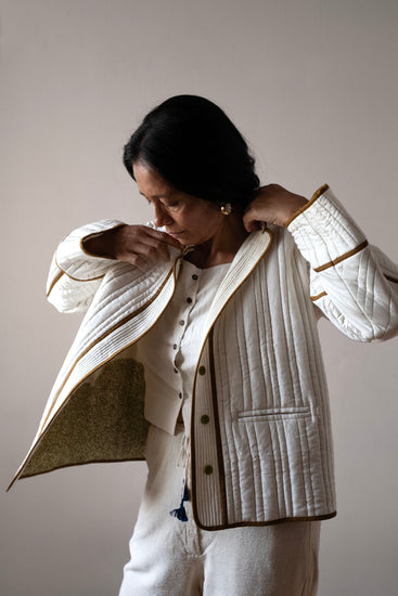 The Shirish jacket is made with luxurious handloom mulberry silk and has a contrasting piping of brown modal silk. The body of the jacket is lined with handloom cotton that has the Serai signature rice grain kantha embroidery in a lemony green colour.