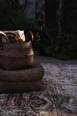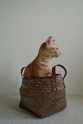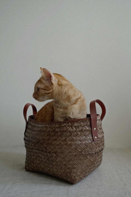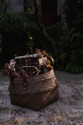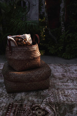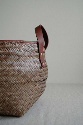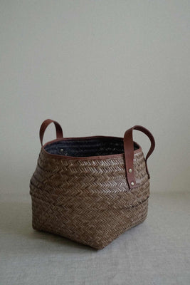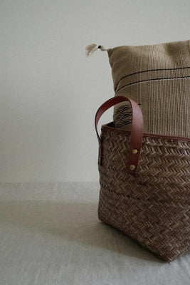 Handwoven in Dala and finished with vegetable tanned Ahimsa leather, the Surahi 01 and 02 are multipurpose utilitarian baskets with a strong aesthetic presence. The Dala is naturally dyed to give a rich dark brown on the outside and ink black on the inside.